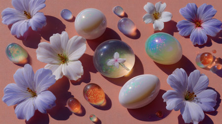 Various smooth, luminous orbs with iridescent or solid white finishes are scattered across a soft, warm-toned background alongside several fresh flowers, some white and some pale violet, creating a visually pleasing, artful arrangement that suggests themes of delicate beauty and natural wonder.