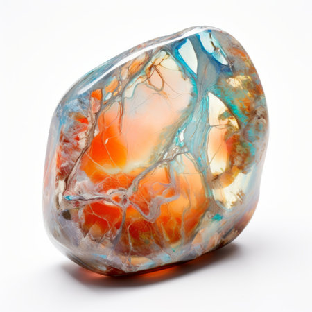 A stunning crystal formation captures natural light, revealing vibrant hues of blue, orange, and red. The intricate patterns of the stone highlight its natural beauty and complexity.