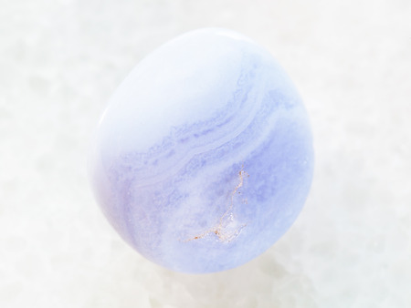macro shooting of natural mineral rock specimen - polished blue chalcedony gemstone on white marble background