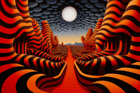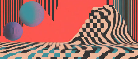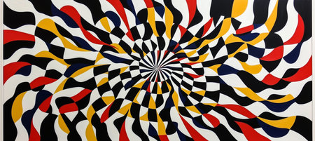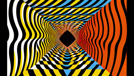 Explore vibrant optical illusions with geometric patterns and bold contrasting colors
