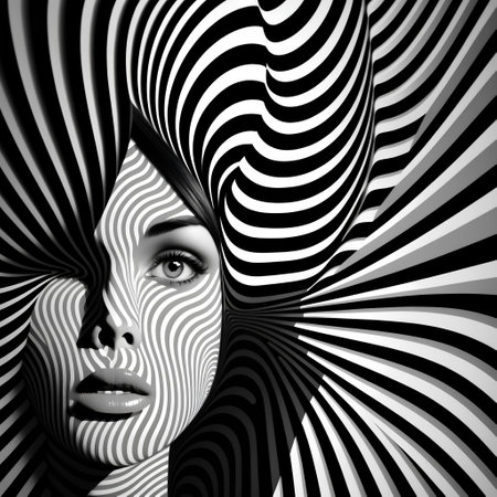 Monochromatic Op Art portrait of a woman with circular shapes and contrasting shades