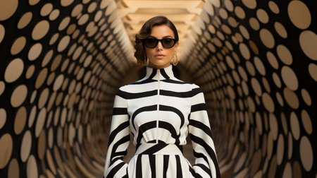 a man stands silhouetted against a black and white grid, reminiscent of op art paintings. the striped pattern creates a surrealistic atmosphere, while the illusion of wallpaper portraits adds an ominous touch. the installation is inspired by pop art, featuring distorted and exaggerated figures. ai generated