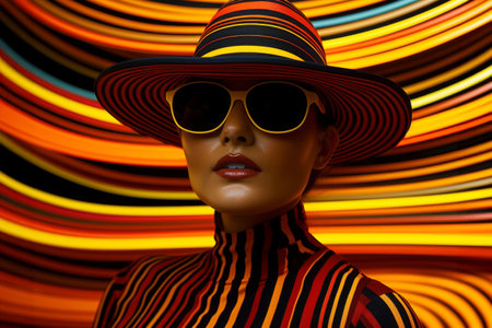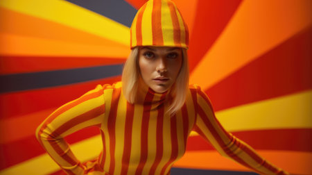 Young female model posing with trendy fashion outfit and colorful vibrant orange optical art abstract background. Picturesque generative AI