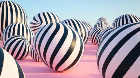 A whimsical arrangement of black and white striped spheres set against a pink surface creates a vibrant and playful atmosphere, blending abstract art with contemporary design.