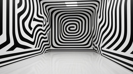Room covered in a black and white spiral pattern, creating an optical illusion. Ideal for backgrounds or abstract design elements.