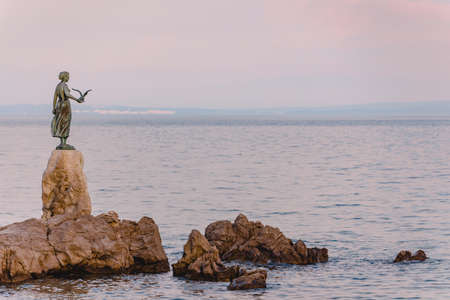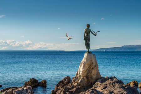 Maiden girl holding a seagull and facing the sea, statue on rocks, Opatija, Croatia