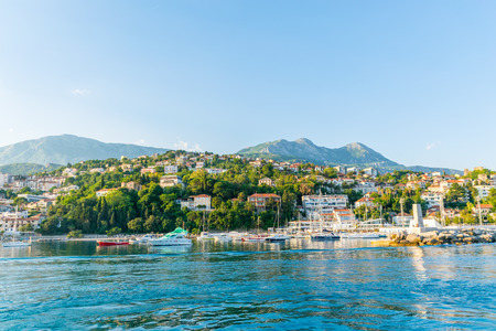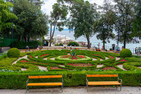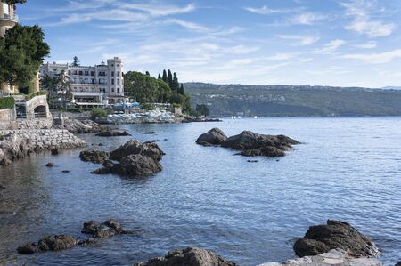 Opatija, Croatia - September 6 2016: Riviera Opatija in the morning, view from the promenade on the most famous hotels. Hot weather in Spetember ensured fully booked accomodations and the operating swimming and bathing facilities.