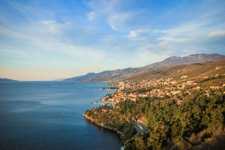 View of beautiful coastal town of Opatija, Croatia. High angle, opatija riviera, tourism, sunny day, spring, summer, tourism.