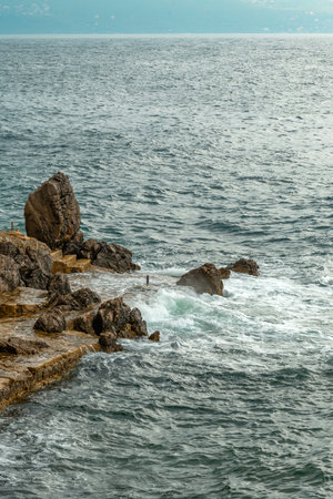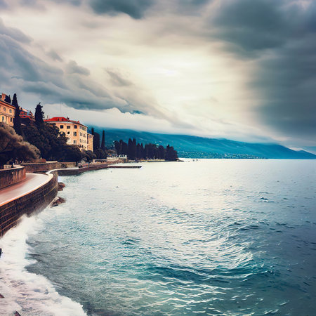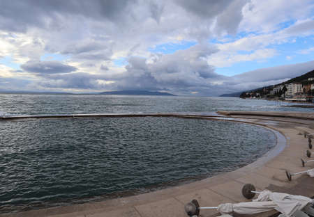 Lovran promenade and coastline, view of Adriatic sea and Kvarner gulf on cold overcast day with stormy clouds at sky