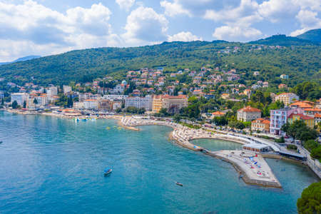 Beautiful panoramic view of Lovran village and its sea shore in Croatia. Top view photo taken on drone.