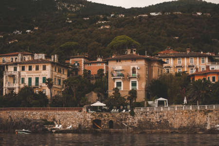 Costal town with hotels and resorts. Costline, sea, summer, vacation, tourism. Lovran, Croatia. Opatija, travel, vacation, no people, shoreline.
