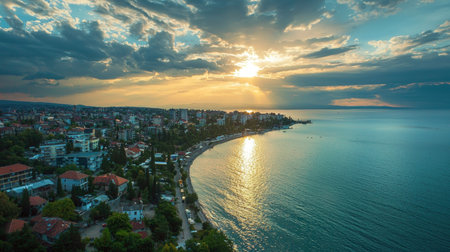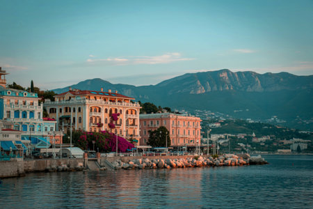 Picturesque seaside town nestled against a backdrop of imposing mountains. Elegant buildings line the waterfront, bathed in the warm glow of the setting sun.