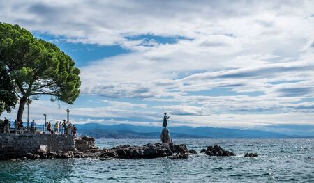 OPATIJA, CROATIA - JULY 3, 2020 - Promenade by the sea near the cape with a statue of a 'Girl with a seagull' in Opatija, Istria, Croatia