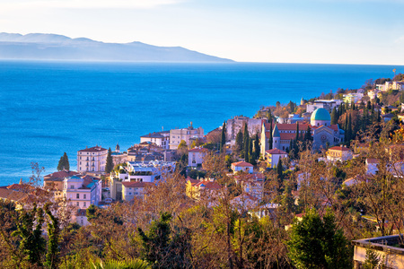 Beautiful Adriatic sea in Croatia, town of Lovran riviera, coastline villas in Kvarner bay
