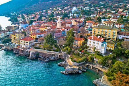 Town of Lovran and Lungomare sea walkway aerial view, Kvarner bay of Croatia