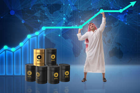 Red arrow pointing up on the oil tank And the oil tank has spilled oil, indicating the high oil price. 3D Rendering.
