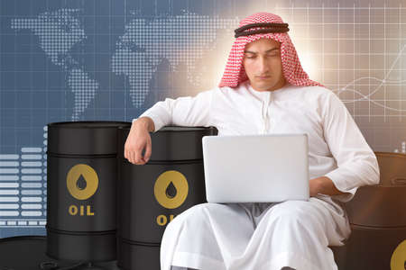 Oil logo glows on dark background. Man in suit next petroleum symbols. Investing hydrocarbons. Concept - investing in fuel market. Oil investor twisted his arms. Concept - African American Oil Broker