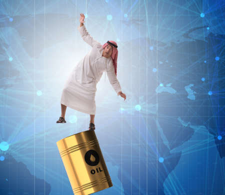 Oil trend down. Candle graph chart Oil barrels and a financial chart on abstract business background. Price oil down. Barrel arrow down.
