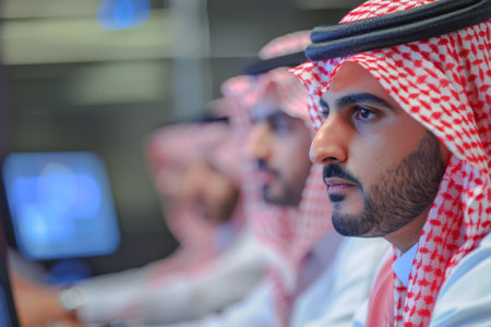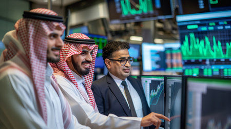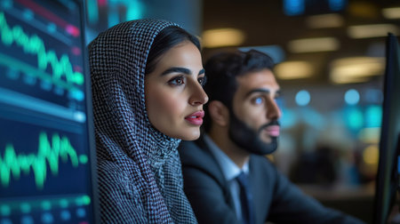 Arab trader investor in front of multiple computer monitors stock market information or data