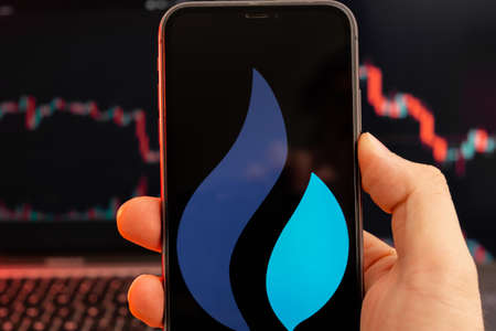 Huobi Token HT app of cryptocurrency stock market analysis on the screen of mobile phone in man hands and downtrend charts trading data on the background, February 2022, San Francisco, USA.