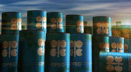 Poznan, Poland, October 24, 2023: OPEC oil petroleum fuel barrels in row concept. Organization Petroleum Exporting Countries oil producing export association industrial containers 3d illustration.