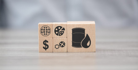 Top view of wooden block written with alphabet of Oil price with green and red arrow represent the oil price crisis during the pandemic virus of Coronavirus.
