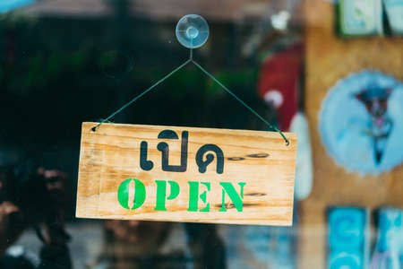Open Sign Hanging on wooden doll in front of entrance door for decoration cafe restuarant.
