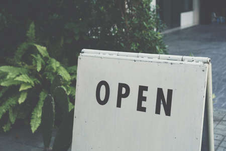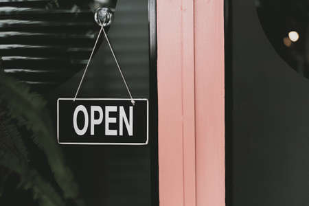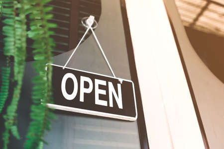 A business sign that says open on cafe or restaurant hang on door at entrance. Vintage color tone style.