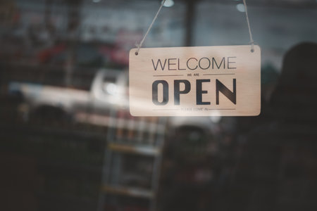 Welcome open sign use for any business in front of shop or online background.