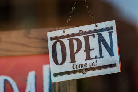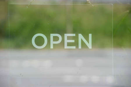 Open sign on the glass of the door at the store