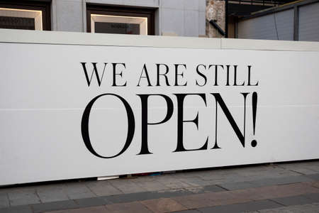 inscription We are still open on the street of Madrid, Spain 2018-08-05