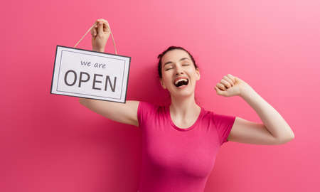 Small business owner smiling and holding the sign for the reopening of the place after the quarantine due to covid-19.