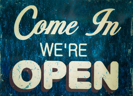 come in we are open sign hanging on a window door outside a restaurant, store, office or other
