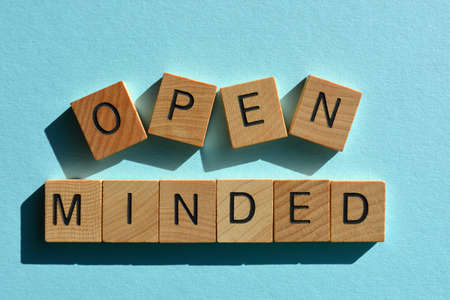 Open Minded, words in wooden alphabet letters isolated on light blue background