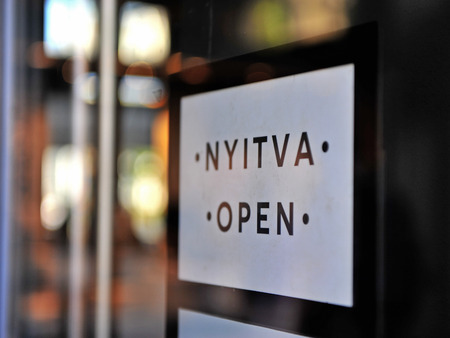 Open sign in english and hungarian languages in the store