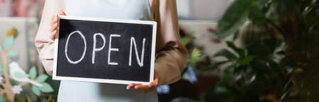 Cropped view of female florist holding chalkboard with open lettering on blurred background, banner