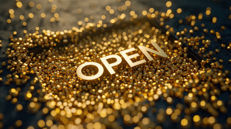 open sign on golden bokeh background. 3D illustration.