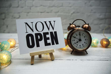 Now Open text and alarm clock on white brick wall and wooden background