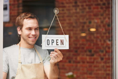 Shot of a male business owner flipping an open for business sign.