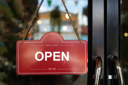 red label open closed sign on glass door is open for welcome customers to the coffee shop