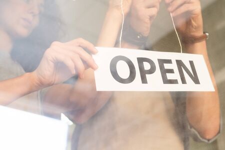 Hands of owners of cafe, restaurant or shop hanging notice announcing open