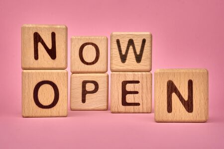 NOW OPEN text made with building blocks, business concept. Now open on pink background. Business service. Opening public places after quarantine. Now Open concept