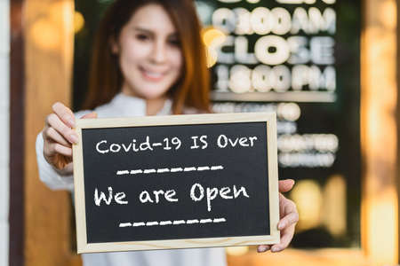 Closeup Asian partner Small business owner hands holding and showing the chalkboard with wording is over and we are open sign in front of coffee shop,new normal after gone,
