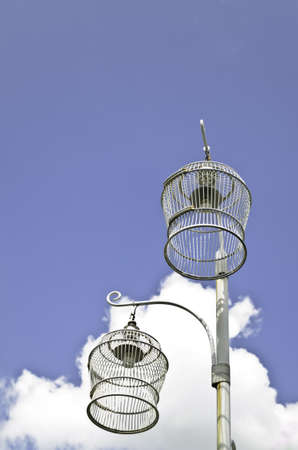 White bird cage lamps against blue sky