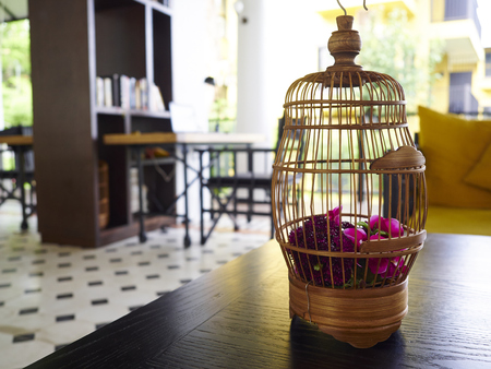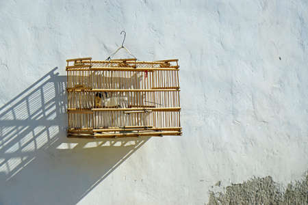 Close up of yellow bird in wooden asia style cage