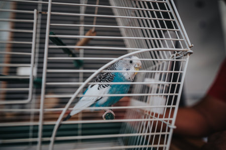 Blue and white budgie inside a small cage, sitting on a perch with a blurred background, showcasing pet care and avian companionship in a domestic setting