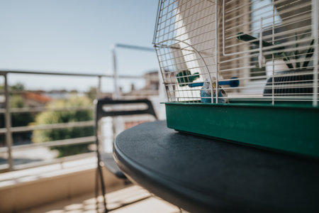 Parakeet resting in a cage on a sunlit balcony table