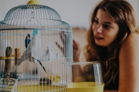 Cozy home interior featuring a hand reaching towards a budgerigar inside a birdcage on a wooden table with soft natural lighting