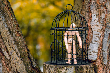 Quarantine lock down, depression and despair. Dummy inside a birdcage placed on a tree. Domestic violence concept.