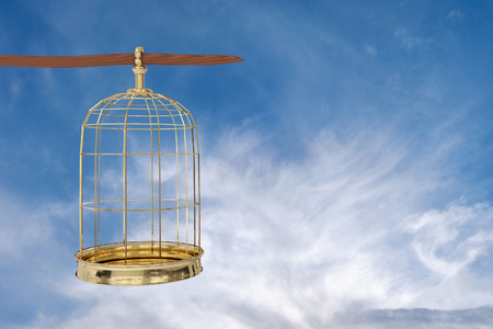 3D rendering of a golden bird cage on sky, freedom concept